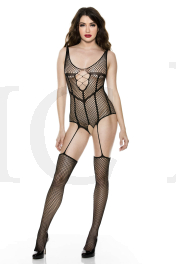NEW! Mini fence net teddy style bodystocking with open crotch and single garter attached stockings