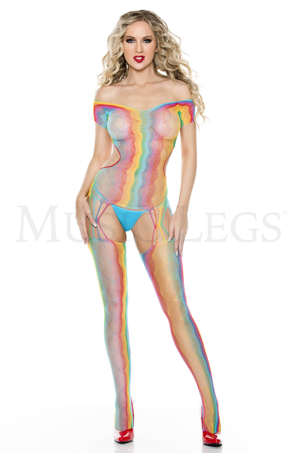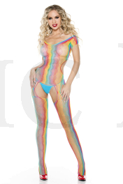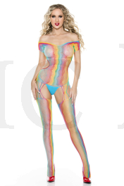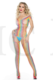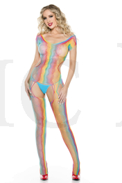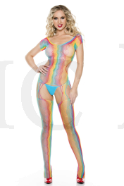 Rainbow net short sleeve bodystocking with open back and attached stockings with front and back multiple string garter straps (G-string not included)