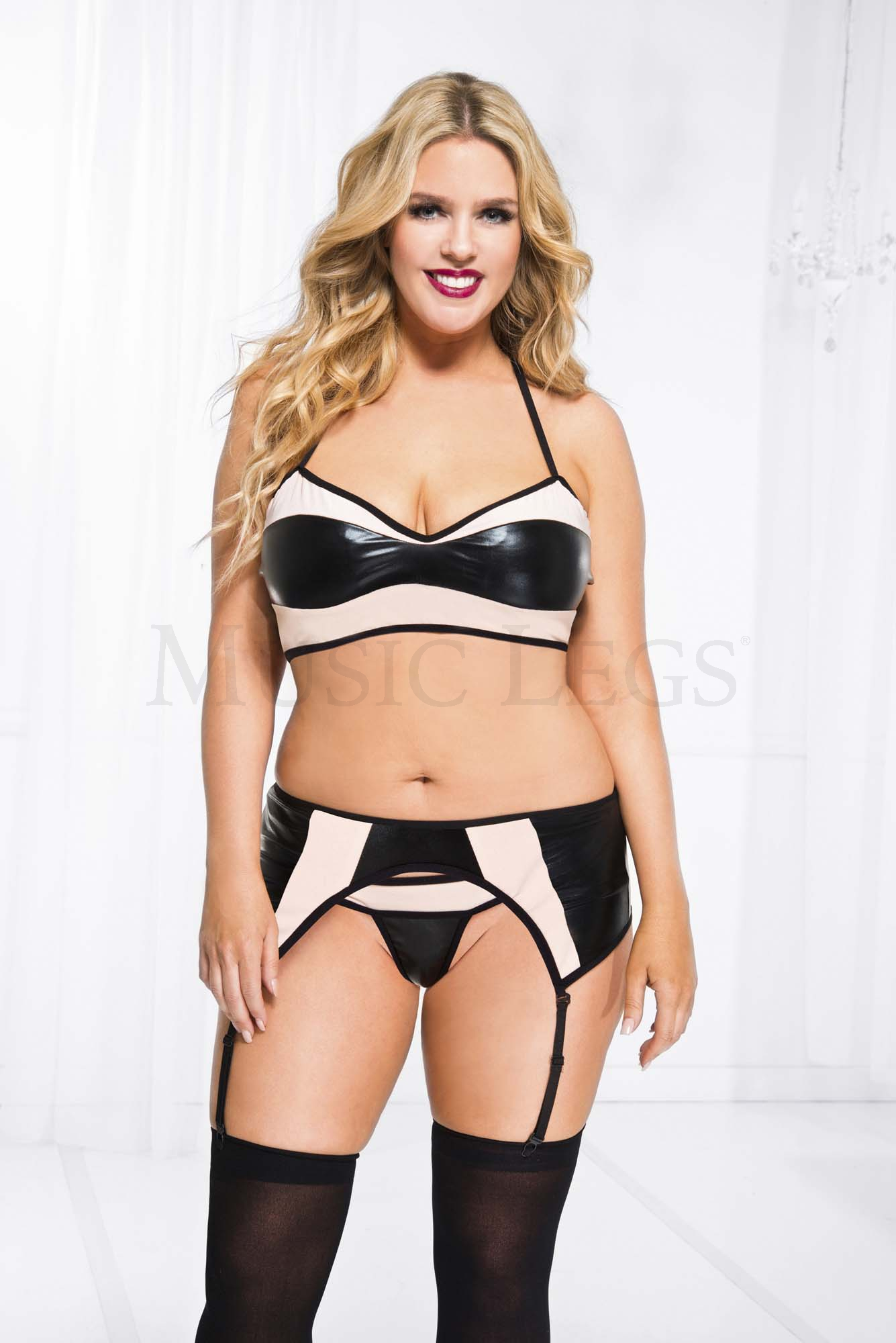 Plus size two tone wet look top with high waist garter and panty (Stockings not included)