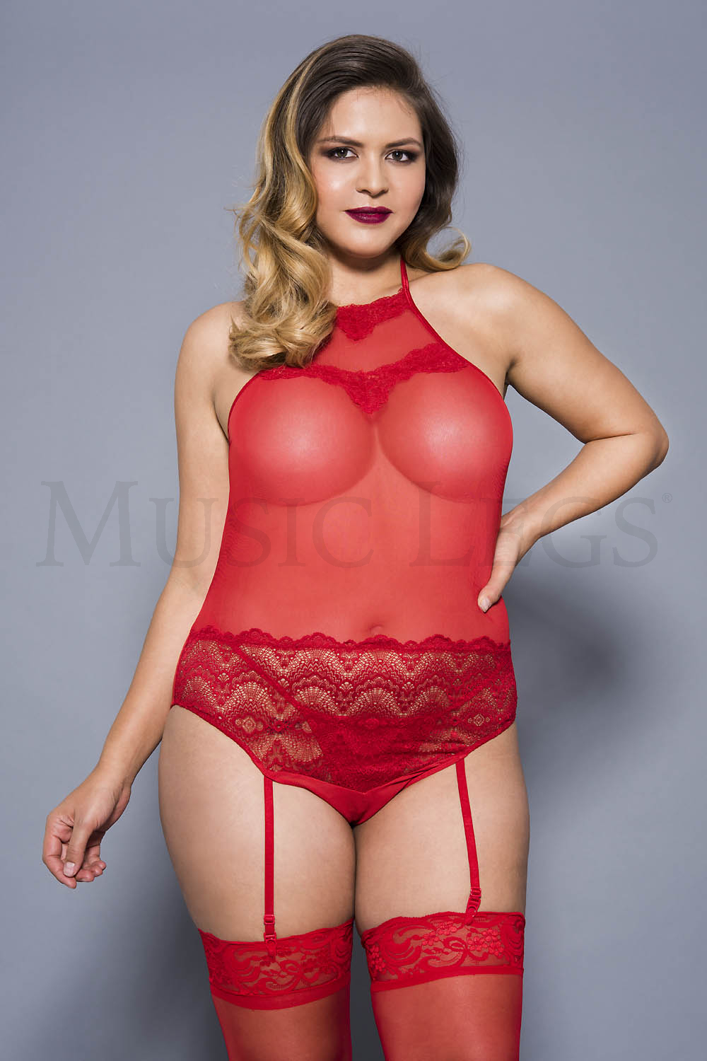 NEW! Plus size high neck lace and mesh teddy with attached garter belts (G-string and stockings not included)