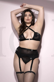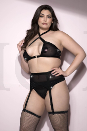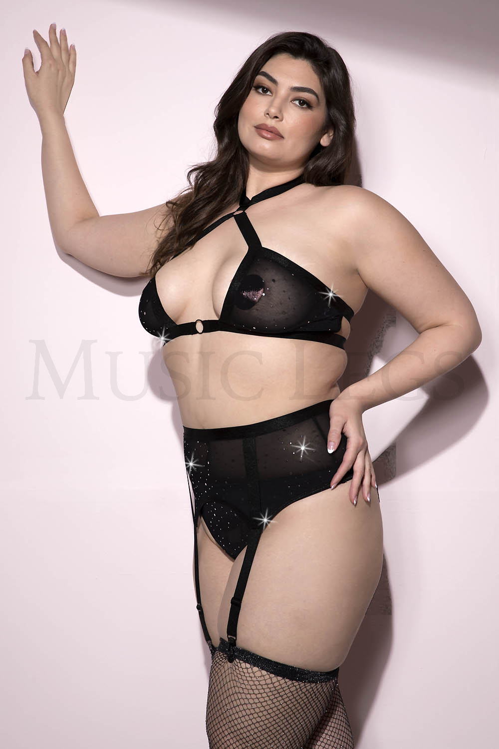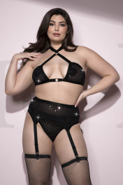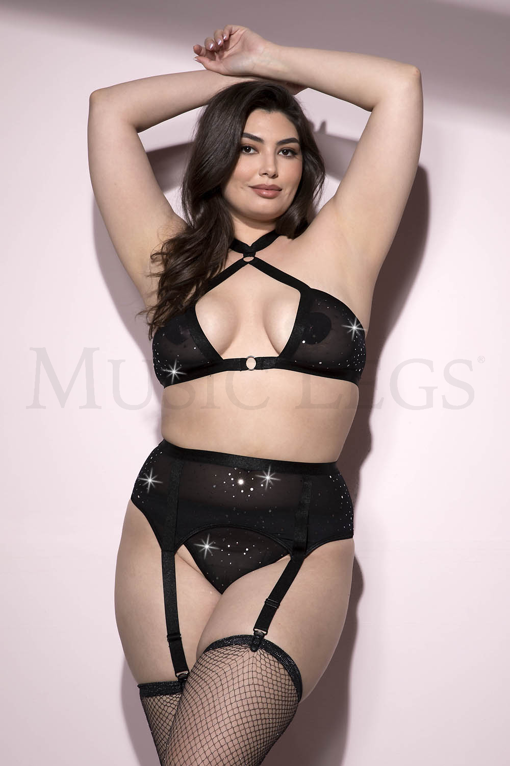 Plus size black cross-body sparkle top with matching panties and garter belt set (Pasties and stockings not included)