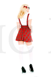 Get educated with this five piece Shy Intellectual School Girl Costume featuring a plaid high waisted skirt with suspenders, button up collared top, hair bows, glasses, and white thigh high stockings.