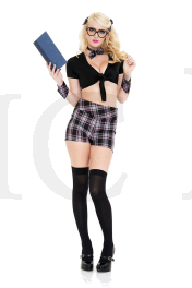 6 pc. High waisted plaid shorts with a short sleeve crop top Includes: hair bows, bow choker, cuffs and thigh hi