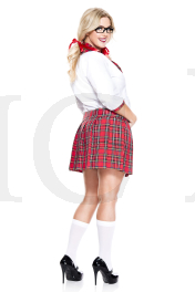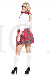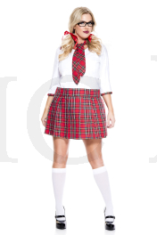 4 PC. includes: Plus size three quarter sleeve top, plaid skirt, hair ties, and matching tie