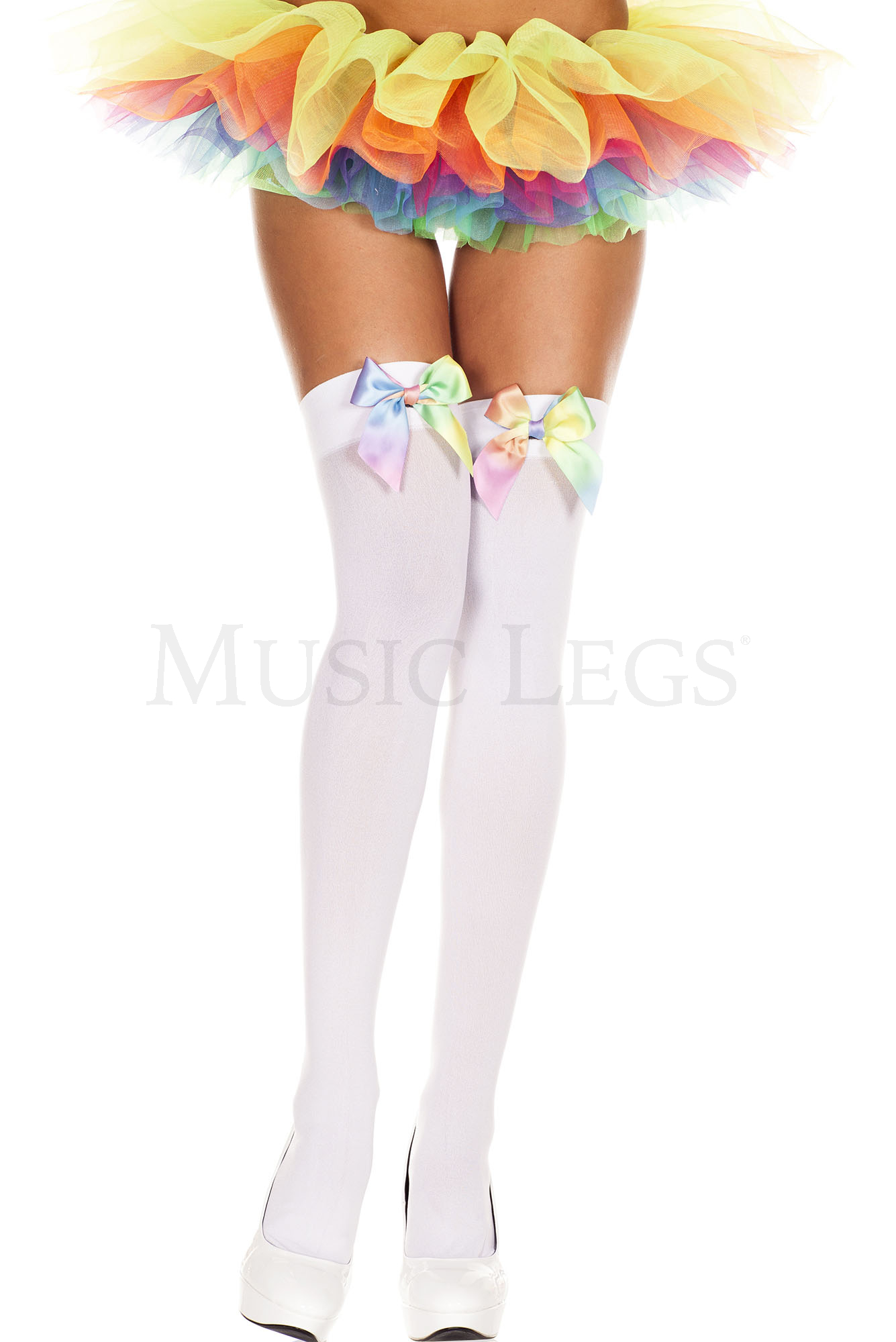 Rainbow satin bow opaque thigh hi