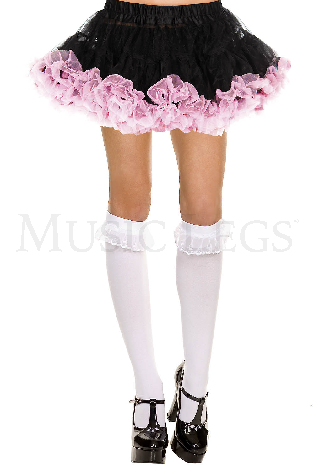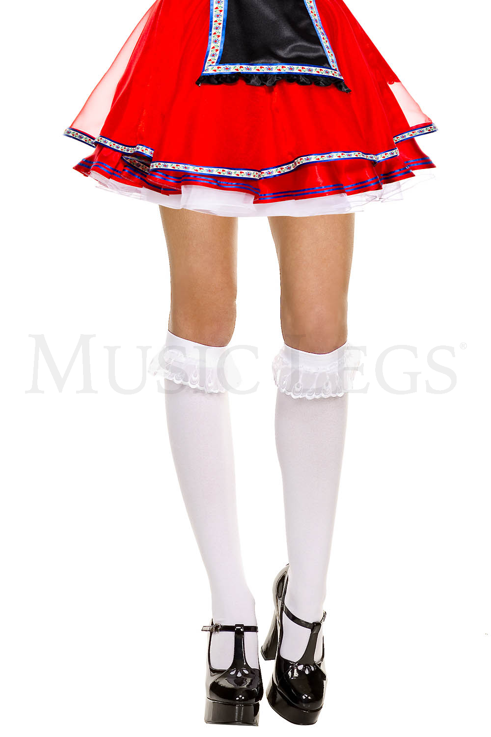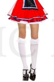 These opaque knee highs feature a ruffle lace trim.