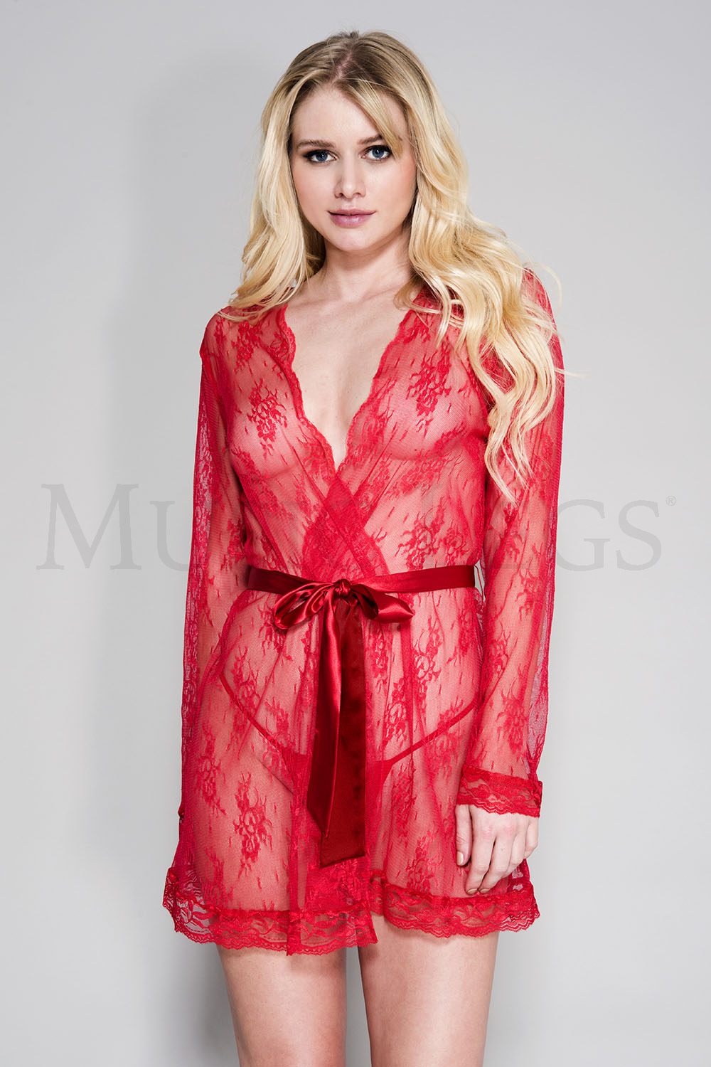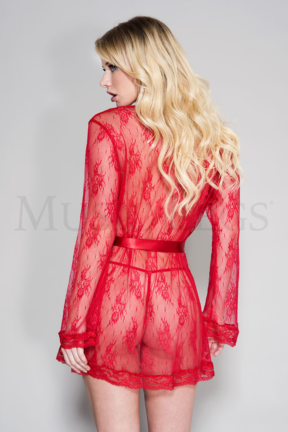 Sheer lace robe with butterfly sleeves and satin waist tie (G-string not included)