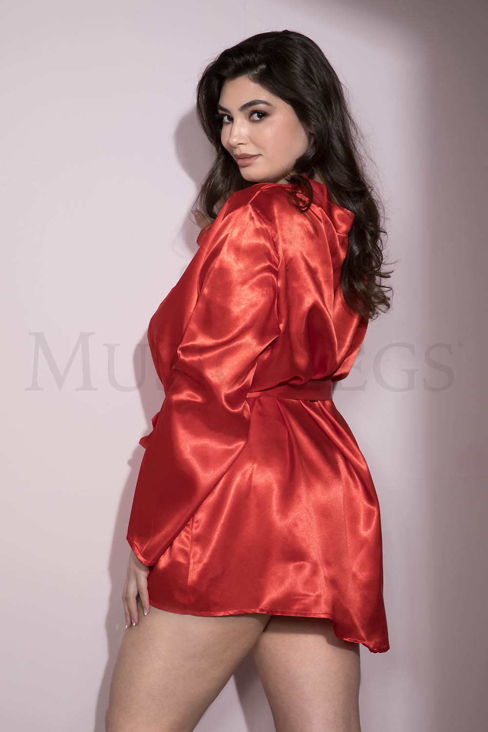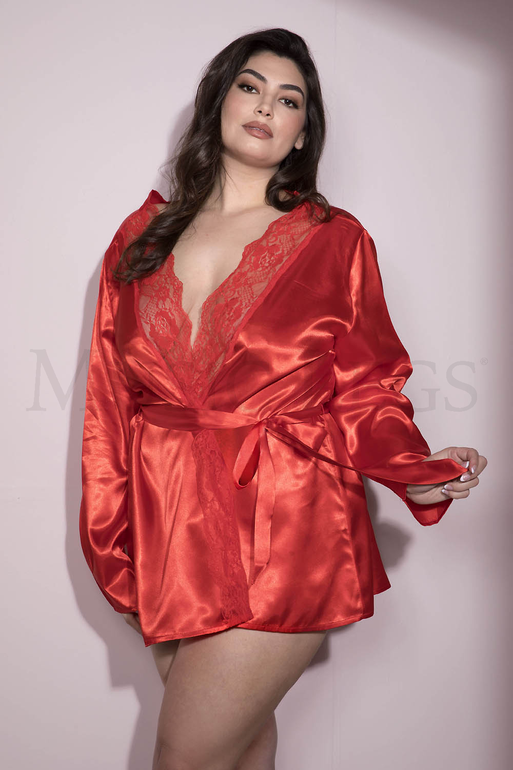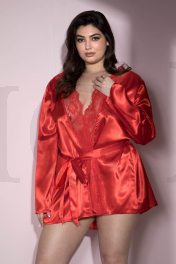 Add a sexy element to your bedroom look with this plus size short satin robe featuring a sheer scalloped lace trim, long sleeves, and a matching tie sash. (Panty and thigh high stockings not included.)
