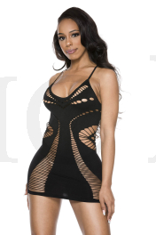 Opaque criss cross back mini with front and back slashed panels, bust cut outs, and side net details (G-string not included)