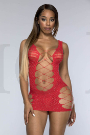 Red mini chemise with rhinestones and faux lace-up cut outs