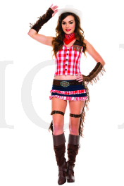 6 pc. Plaid cowboy outfit with faux suede frills and denim skirt Includes: cowboy hat, scarf, arm warmersand belt holster