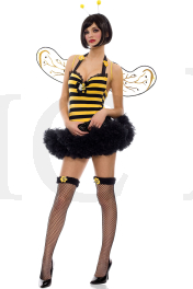 3 pc. Cute halter bumble bee dress with attached petticoat, belt and lace up back Includes: antenna and wings