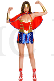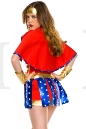 4 pc. Metallic halter dress with star print skirt.Includes: headband, cape and gauntlet