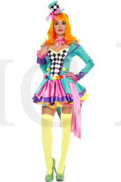 5 PC. Includes: Long tail tuxedo dress with peplum skirt, button up front and oversize bow in the back (petticoat not included), top hat, bow tie, belt and handkerchief