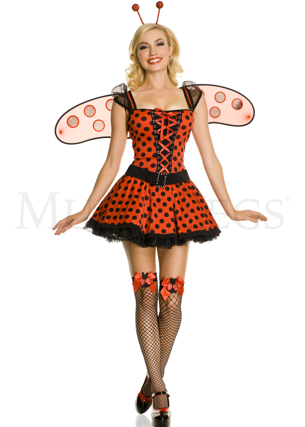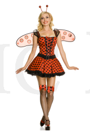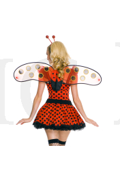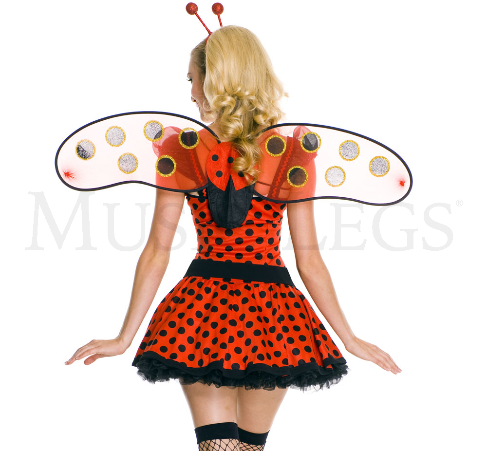 4 pc. pleated lady bug dress with organza ruffled sleeves and front lace up details Includes: antenna, belt and wings.