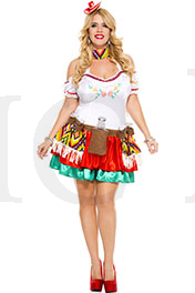 4 pc. Plus size embroidered sweetheart neckline peasant style dress with colorful multi layered skirt Includes: scarf, mini sombrero and bottle holster
