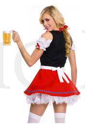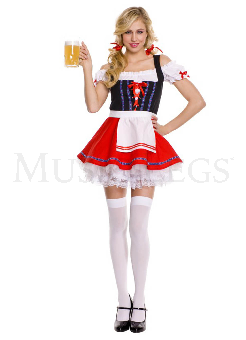 The Sumptuous Beer Girl costume is a three piece set that features a bavarian beer girl style dress with off the shoulder sleeves, red lace up bodice and attached apron. It also includes hair bows and thigh highs. (Petticoat not included.)