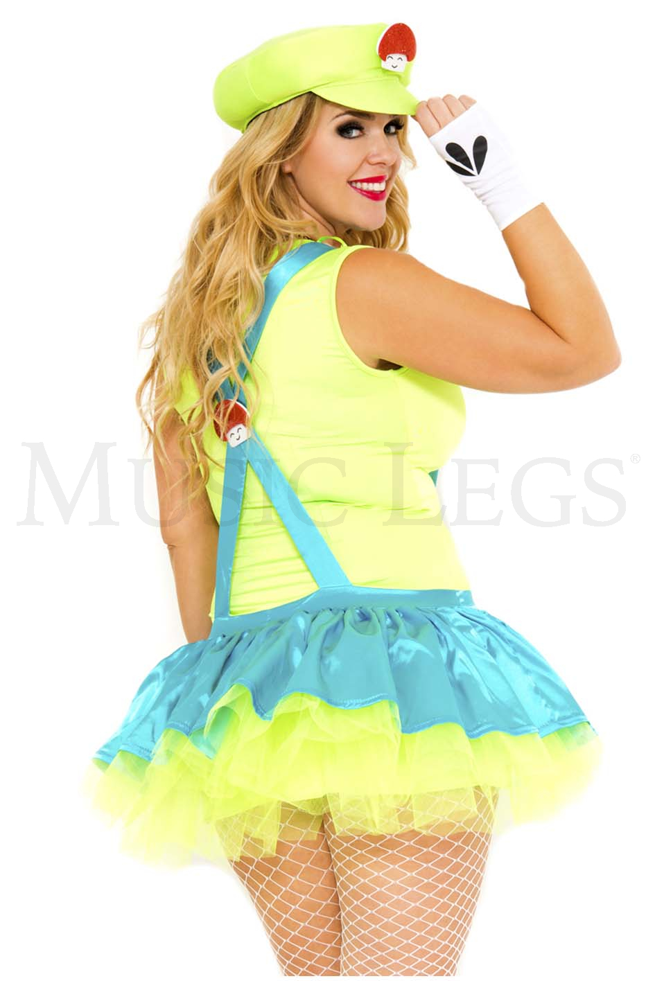 4pc. Suspender dress with tutu skirt and mushroom appliques Includes: hat, necklace, and arm warmer