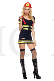 The Fire Hazard Honey cost Bring the heat in Firefighter Babe costume featuring a black suspender skirt, red suspenders, reflective tape detailing, black top, firetruck emblem, and a matching red firefighter hat. (Tights and boots not included.)ume features a red suspender skirt with reflector trim black shirt with reflector trim. (Hat & Stockings not included.)