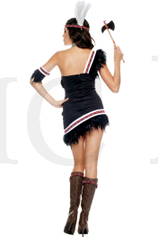 5pc. One shoulder feather trimmed dress.Includes: arm band, choker, headpieceand toy tomahawk