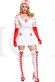 5 pc. Plus size ruffle trimmed scoop neck nursewith pleated skirt dress Includes: head piece, choker, gloves and thigh hi