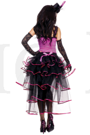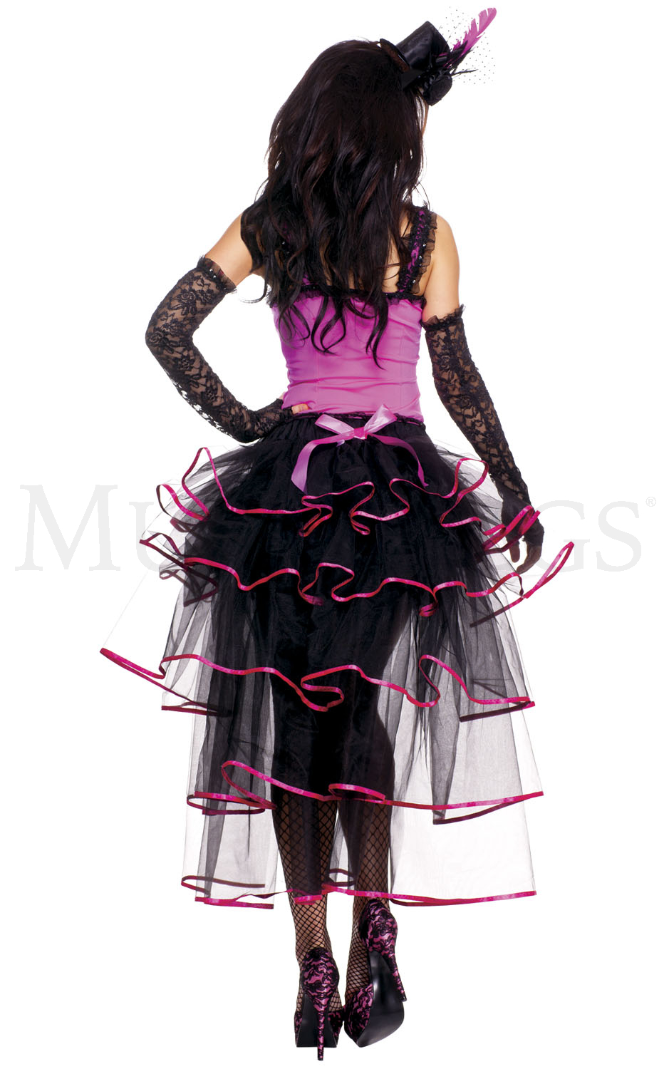 4 pc. Burlesque corset top and multi layered long back ribbon trimmed skirt Includes: lace gloves and burlesque hat