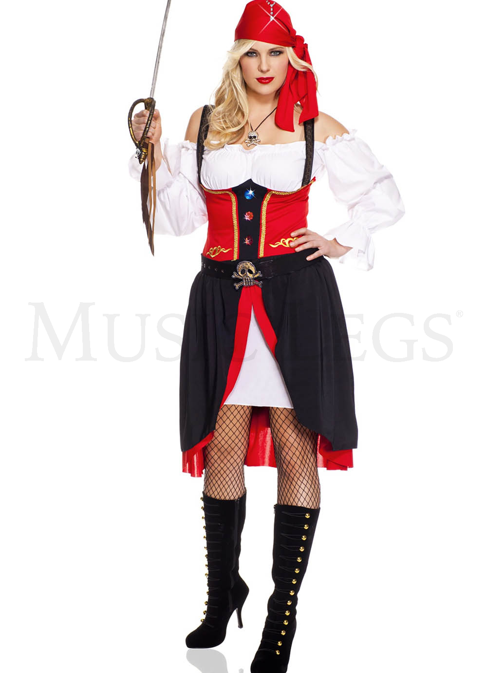The Plus Size Jewel of the Night Pirate costume is a three piece set that features a long dress with white long sleeves, jeweled center detail, gold accents, white undercoat and layered open front bottom. It also includes a head scarf and belt with cross bone buckle. (Stockings and sword not included.)