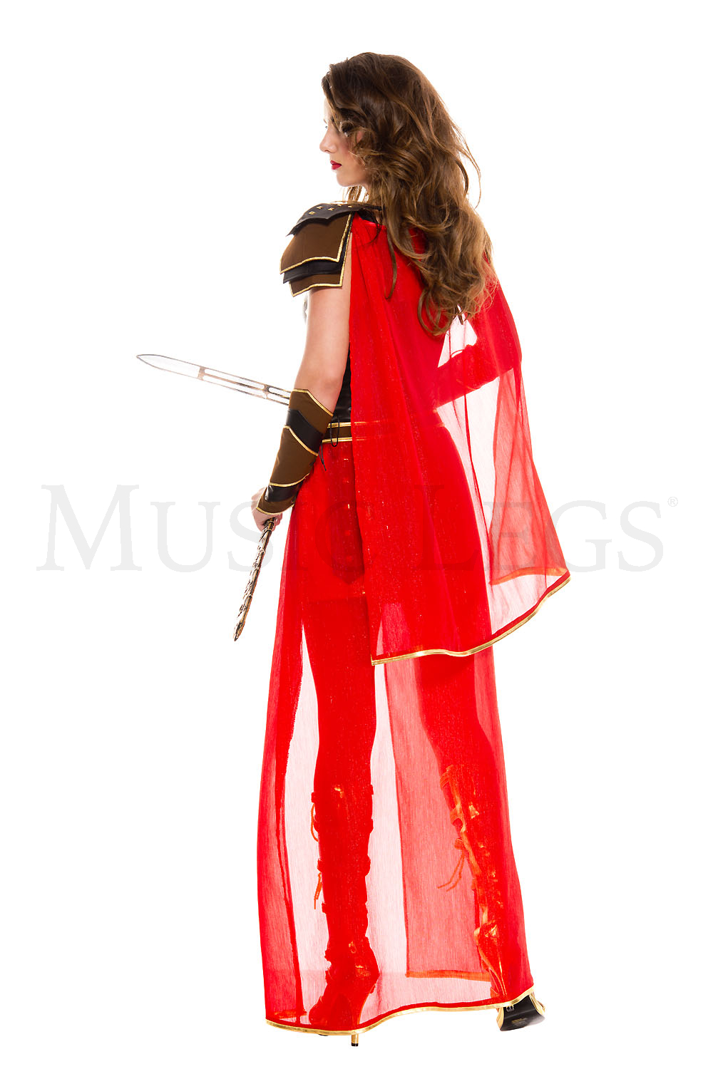4 PC. Includes: Metallic gold body wrap with studs and epaulette lame dress, cape, detachable train and gauntlets