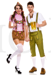 This two piece Mr. Oktoberfest costume features a lace up collared shirt with adjustable suspenders and Bavarian inspired printed shorts. (Beer glass and knee high socks not included.)