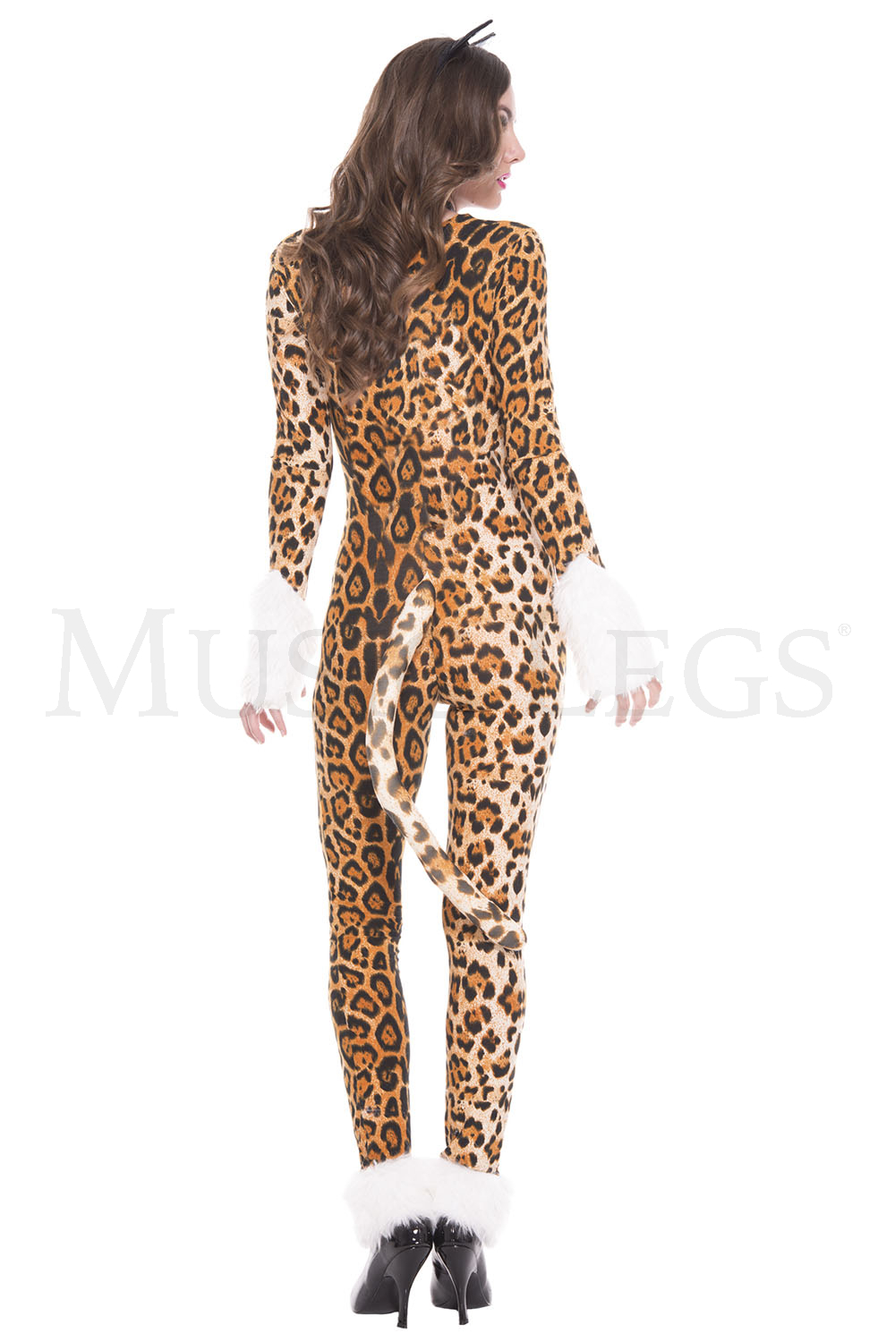 4 pc. Leopard print catsuit with marabou trim Includes: cat ears, choker and detachable tail