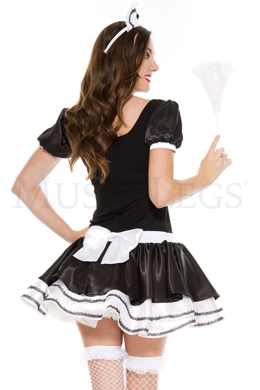 4 PC. Includes: French maid uniform, featuring lace trim keyhole front and layered skirt with lace trim, headpiece, choker and feather duster