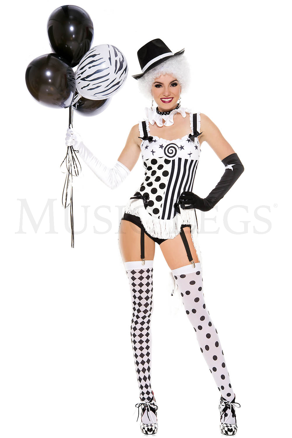 6 PC. includes: Black and white long tail clown top, shorts with garter clips, hat, gloves, ruffle collar and thigh hi