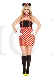 This four piece Plus Size Darling Mouse costume features a red and white polka dot mini dress with attached suspenders, mouse ears, bow tie choker and white gloves. (Stockings not included.)