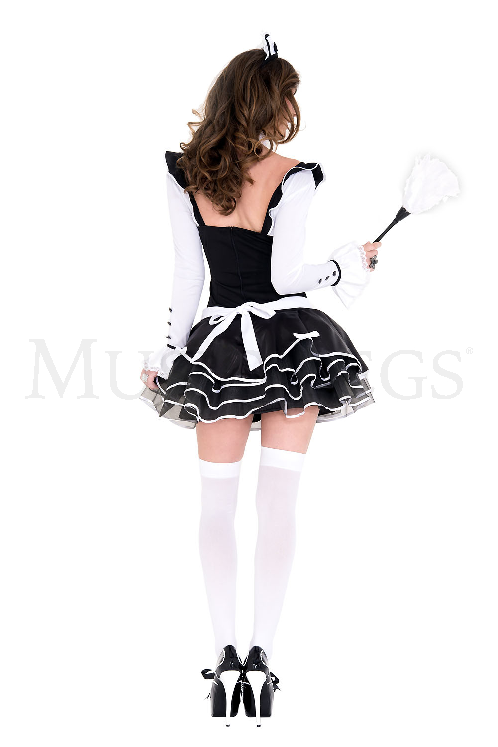 4 PC. Includes: Long sleeve outfit with lace up details and attached fancy skirt, headpiece, choker and feather duster