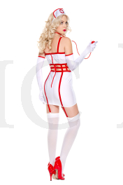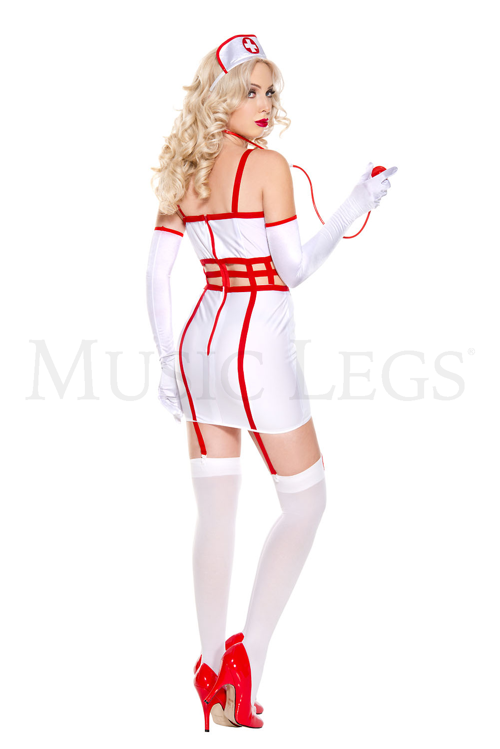 Practice your bedside manner in this Sexy Caged Nurse costume featuring a white sexy nurse dress, cage cutout details, garters, red accents, strappy front, v-neckline, cross accents. matching headpiece, white gloves, stethoscope, and matching thigh highs. (Shoes not included.)