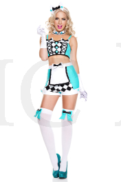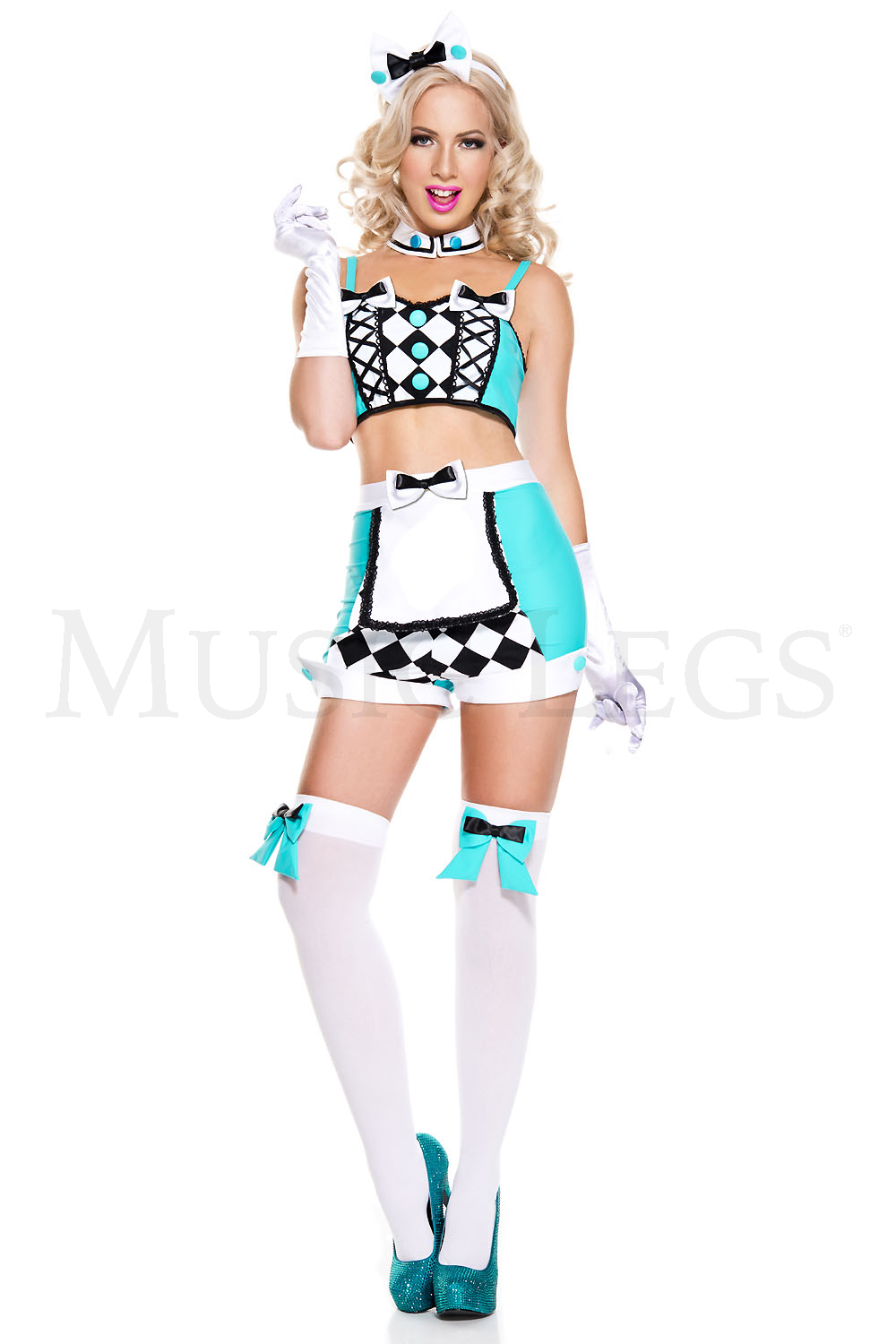 Hang out in Wonderland in this Wonderland Beauty costume featuring a blue crop top, checker print bodice, blue button details, lace up accents, bow embellishments, matching high waisted shorts with apron detail, matching bow headband, matching choker, white gloves, and matching thigh high stockings. (Shoes not included.)