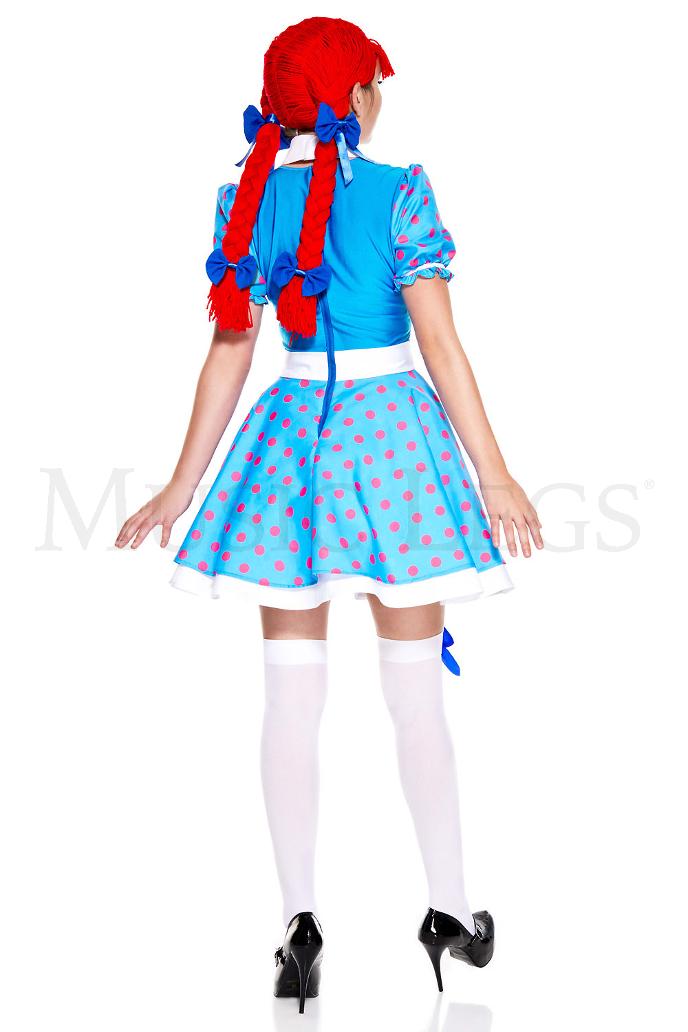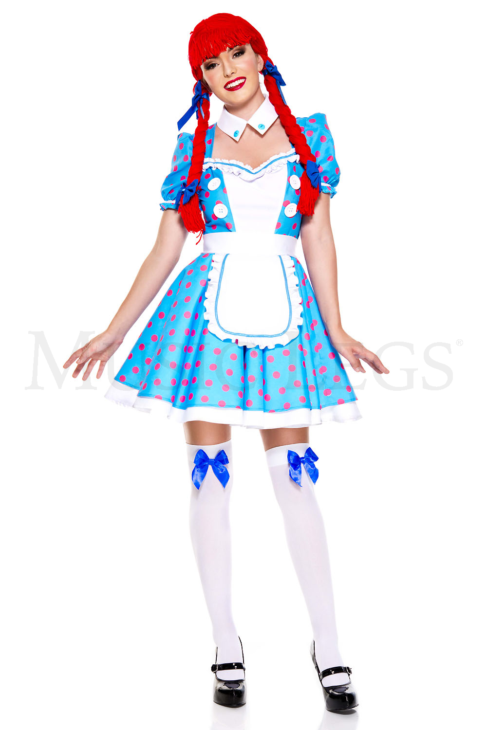 Bring your childhood to life in this Racy Rag Doll costumes featuring a blue dress with lightly puffed sleeves, a sweetheart neckline with a ruffled trim, white button accents, a white apron detailing with a blue ribbon trim, an allover pink polka dot design, a white hem, and a white collar with blue button accents. (Wig and thigh high stockings not included.)