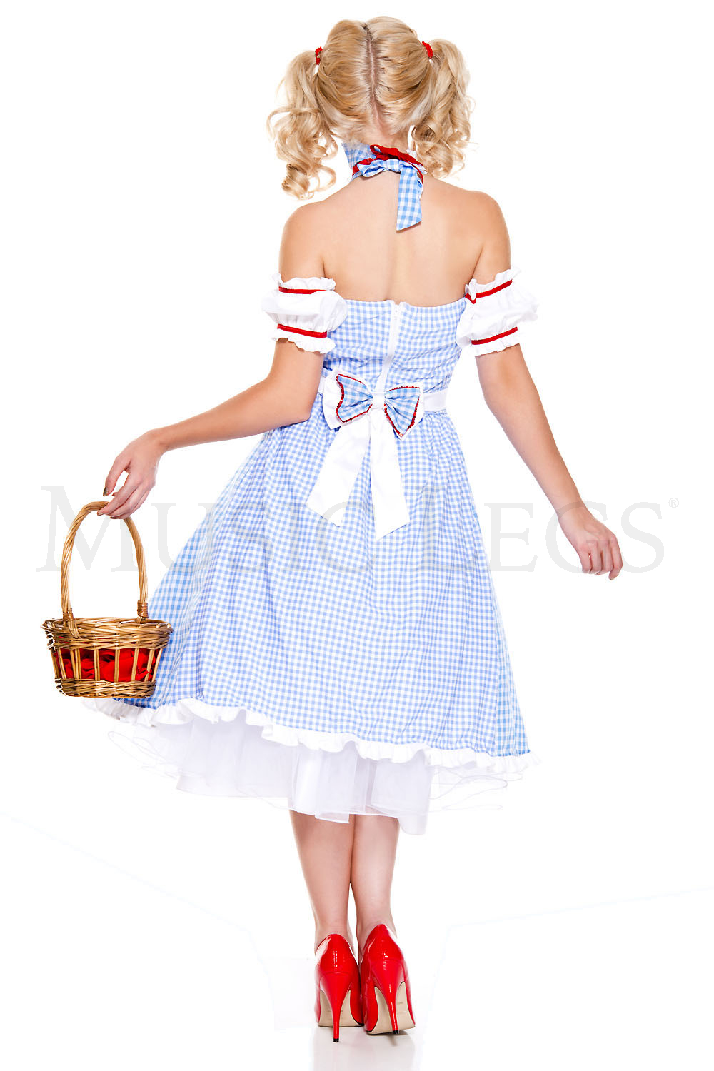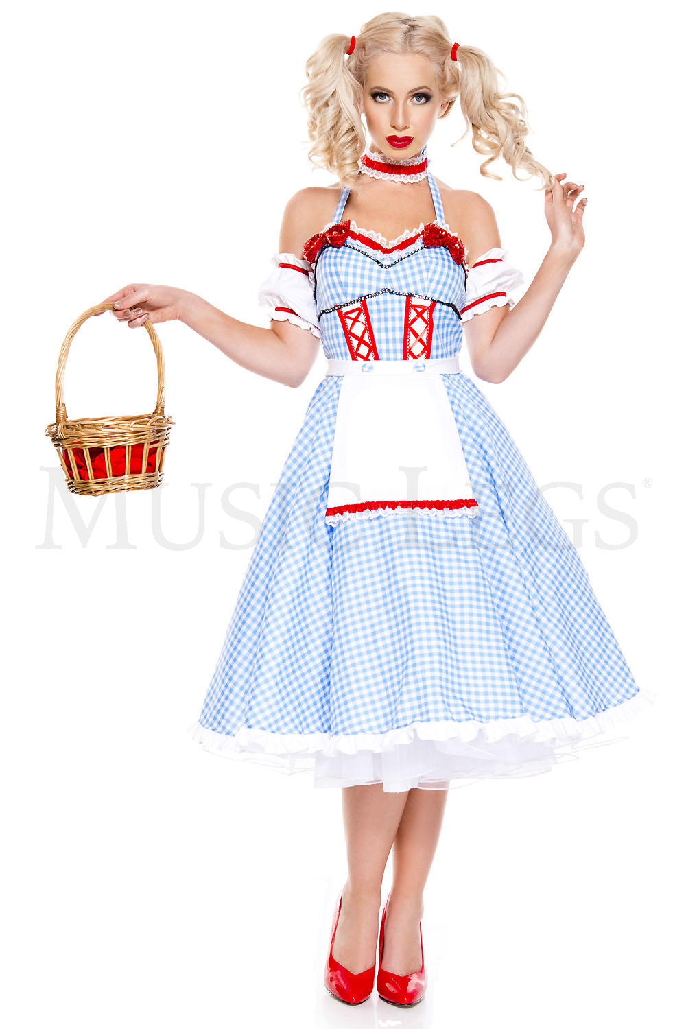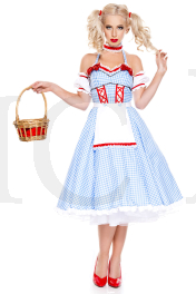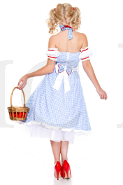 Make your way out of Kansas in this Dorothy Doll costume featuring a blue and white gingham tea dress with halter straps, a sweetheart neckline with a ruffled trim, red bow accents, red lace-up detailing, an attached white apron with a red and white ruffled trim, a back zipper closure, a back bow accent, white puffed sleeves with red ribbon detailing, a matching ruffled choker, and red hair clips. (Basket and petticoat not included.)