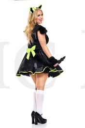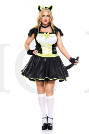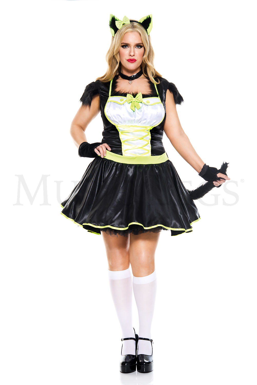 You'll have a purrfect Halloween in this plus size Furry Cats Meow costume featuring a black satin dress with white ruched cups, a furry trim, furry sleeves, a green lace-up detailing, green bow accents, a matching waistband, a back zipper closure, a black choker with charm, black fingerless gloves, a matching cat ear headband with bow, and a furry tail. (Petticoat and knee high stockings not included.)