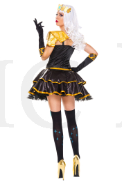 Rule over your kingdom in this Elf Princess cosplay costume featuring a short dress with spaghetti straps, a gold trim, a gold applique with teal accent, a small peplum, an apron front panel with gold triangle detailing, a matching headpiece with teal jewel accent, gold shoulder pads, a gold belt, matching gloves with criss-cross gold detailing, and thigh high stockings with blue bow tops and star detailing. (Petticoat not included.)
