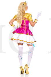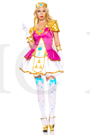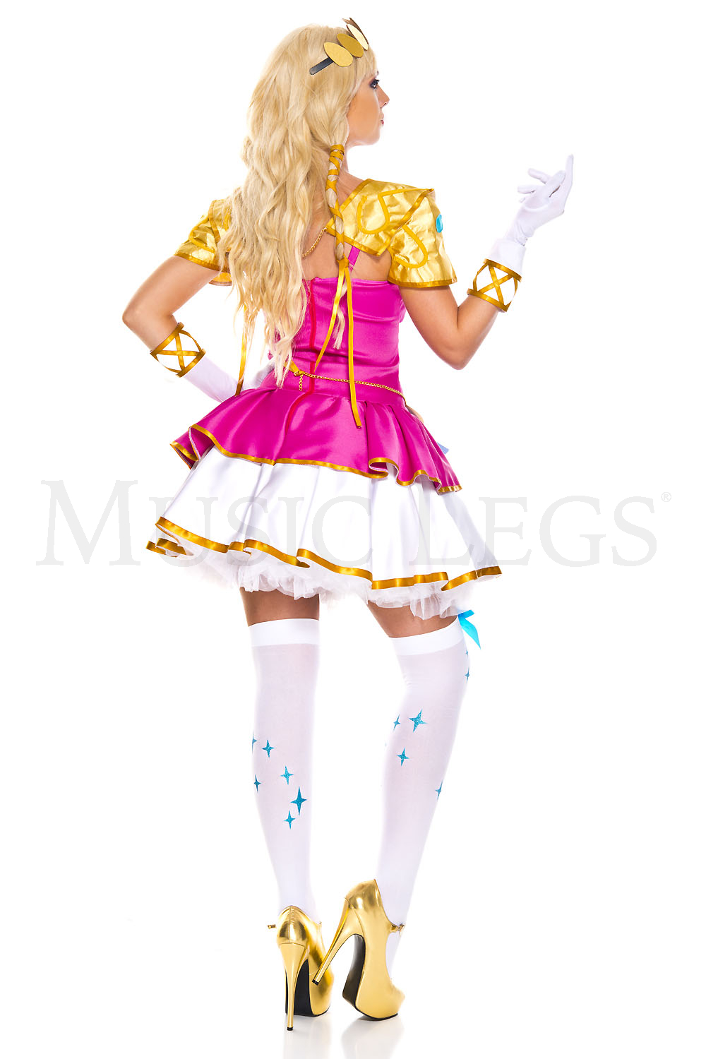 Rule over your kingdom in this Elf Princess cosplay costume featuring a short dress with spaghetti straps, a gold trim, a gold applique with teal accent, a small peplum, an apron front panel with gold triangle detailing, a matching headpiece with teal jewel accent, gold shoulder pads, a gold belt, matching gloves with criss-cross gold detailing, and thigh high stockings with blue bow tops and star detailing. (Petticoat not included.)