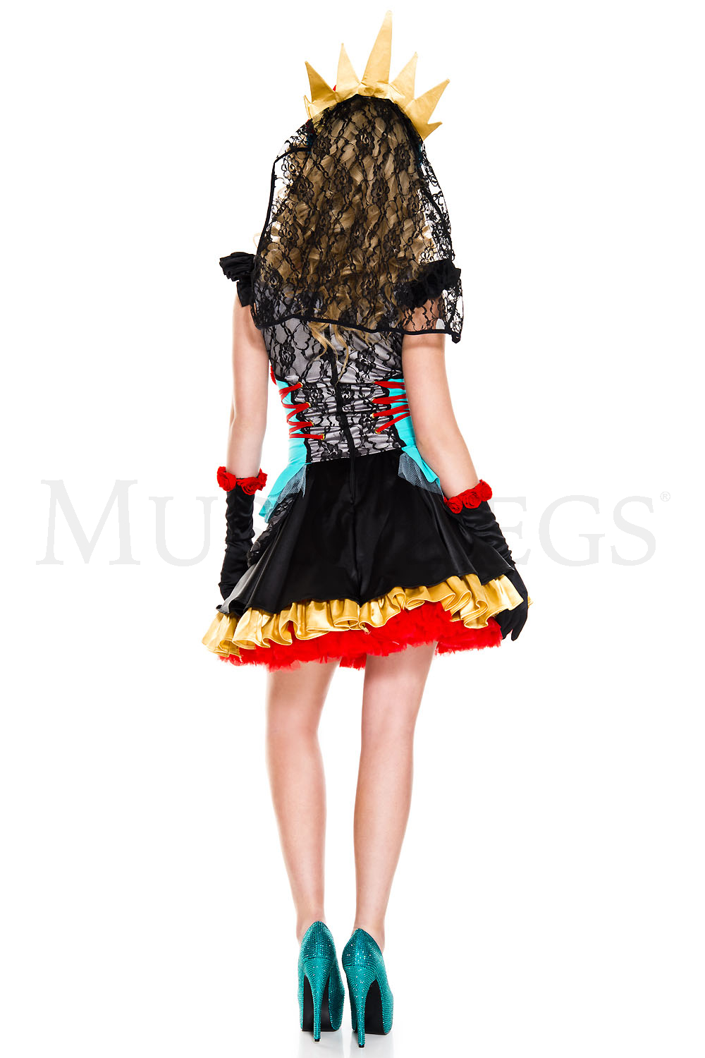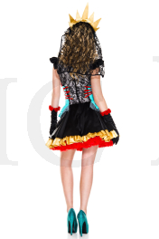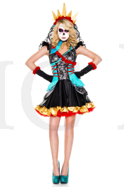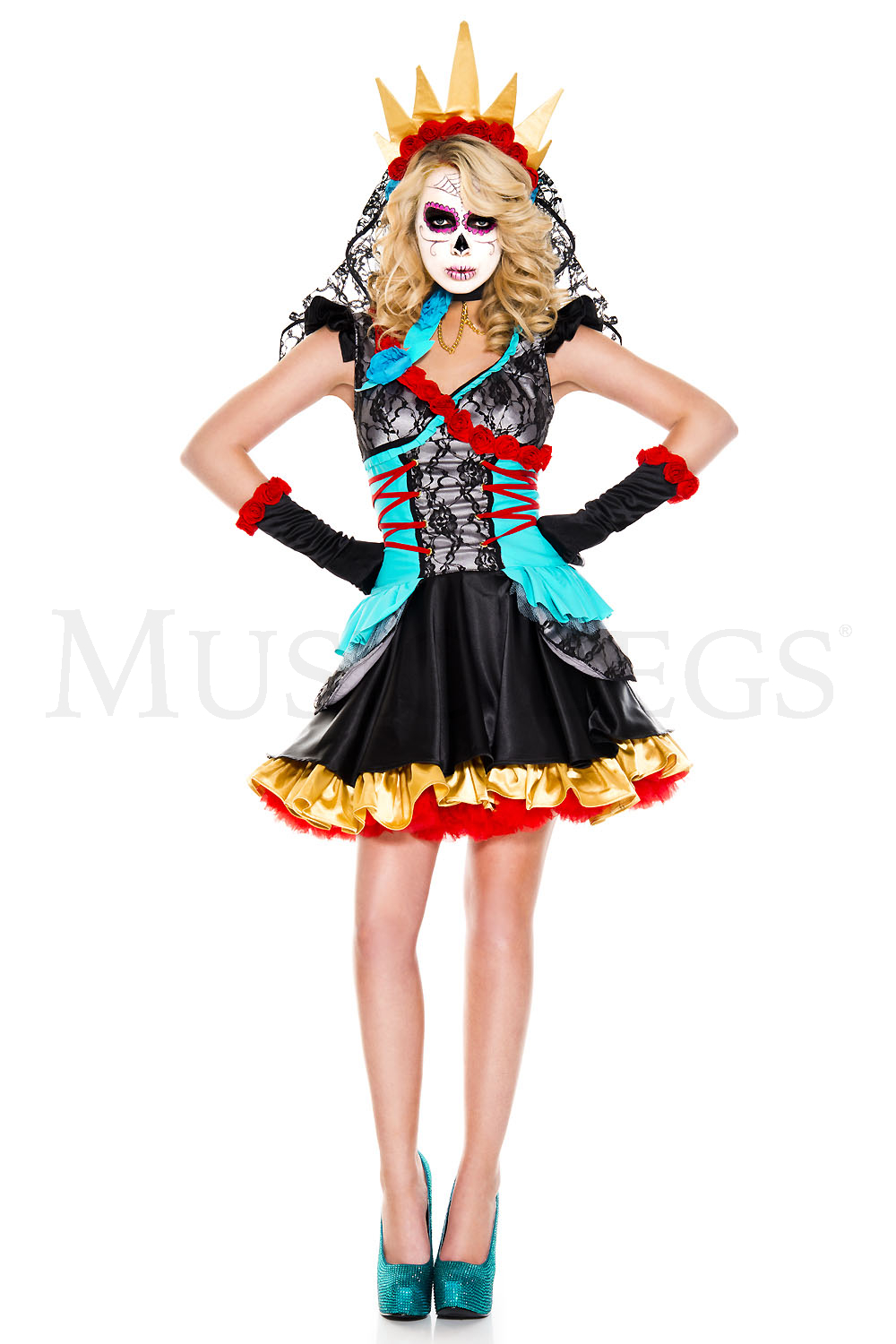 Party for the dead in this Day Of The Dead Darling costume featuring a black dress, lace bodice, blue waist accents, gold and red skirt layers, red lace up details, rose accents, matching crown with black lace veil, matching choker necklace, and matching gloves. (Shoes and face paint not included.)