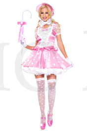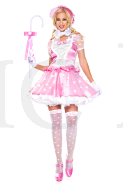 5 PC. little bo peep Includes: satin polka dot pink dress, hat, gloves, thigh hi and crook