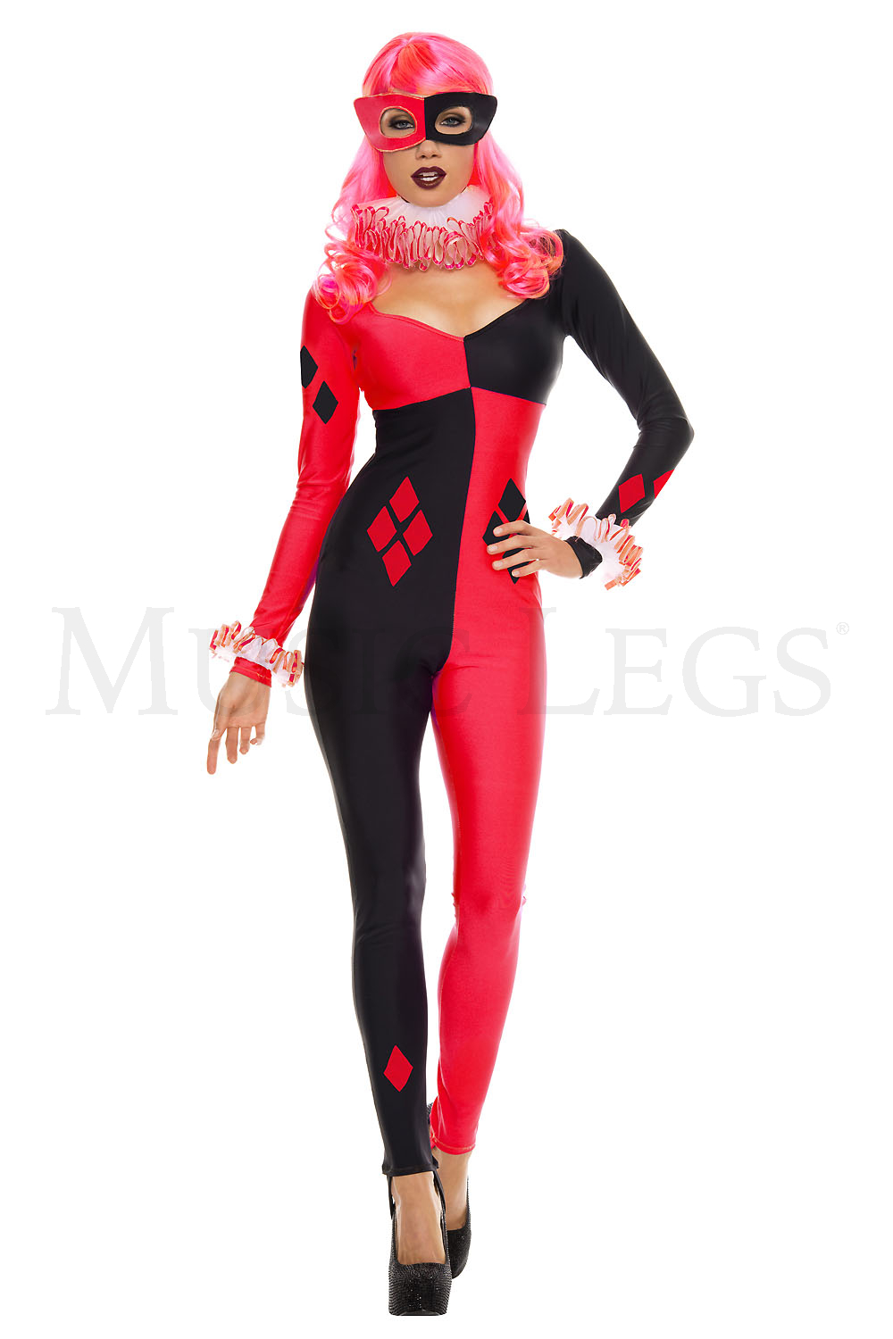 4 PC. includes: Stretch long sleeve jumpsuit, mask, ruffle choker, and cuffs