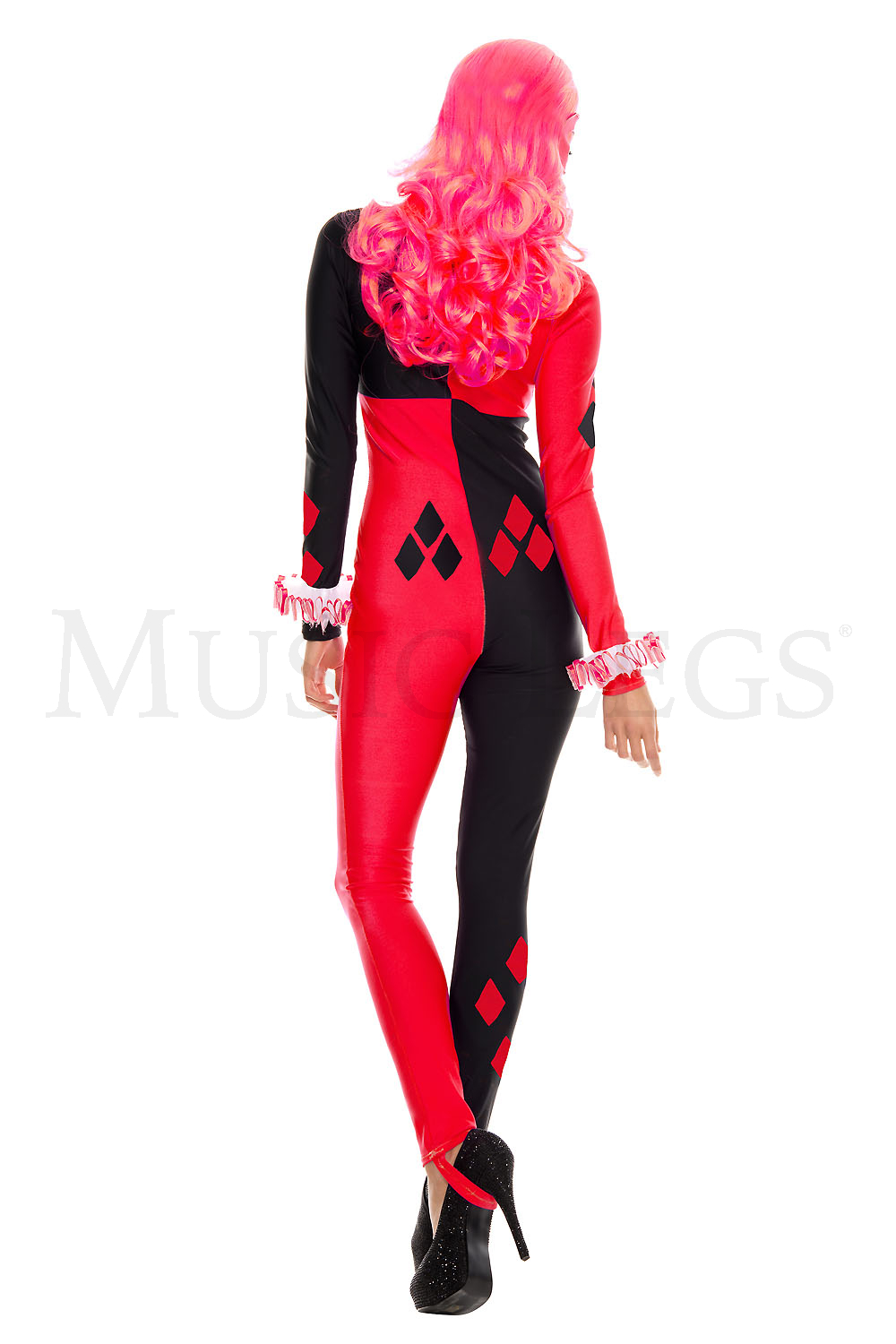 4 PC. includes: Stretch long sleeve jumpsuit, mask, ruffle choker, and cuffs