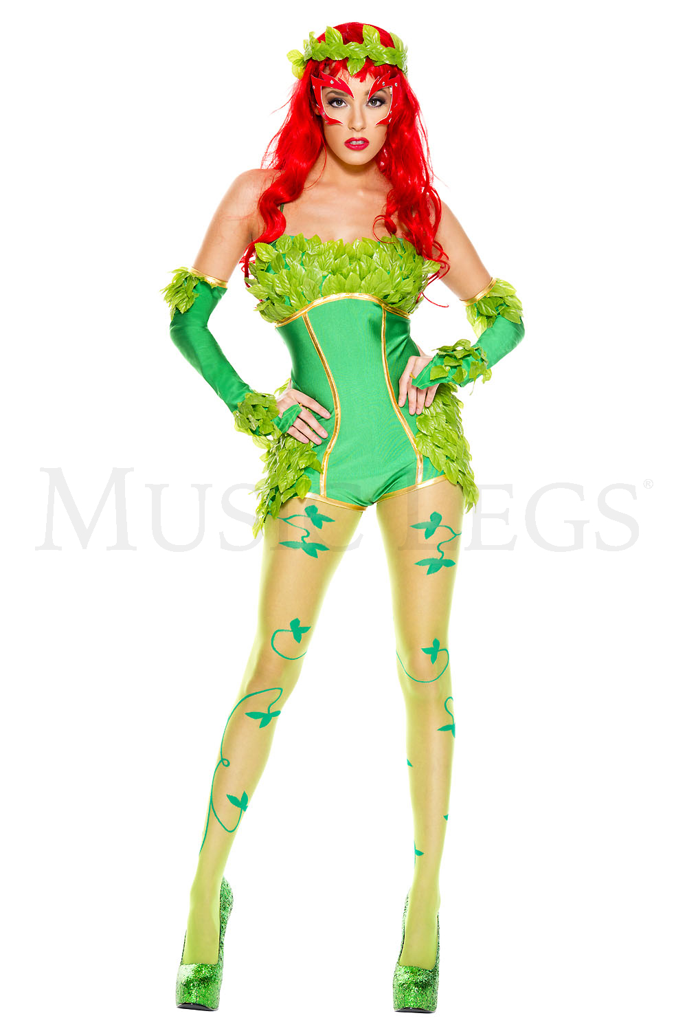 5 PC. Includes: Leafy gold trim romper, headband, mask, gloves