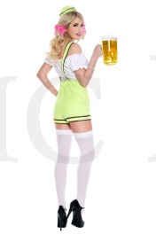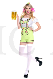 4 pc. Ruffle trim top with high waisted suspender Bavarian shorts with floral brocade trim.Includes: hat and 2 oversize hair bows