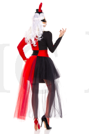 Show them who's boss in this plus size Steampunk Harley costume featuring a black and red jester strapless dress, white ruffle neckline, attached black and red mesh train, matching jacket, front cutout, pointy shoulders, buckle detail, matching jester hat, and a black eye mask. (Tights and shoes not included.)