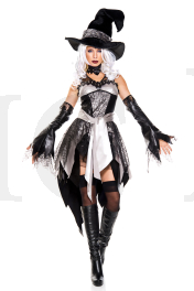 5 PC. Glam witch Includes: wicked layered dress with studs details, hat, choker, sash and sleeves