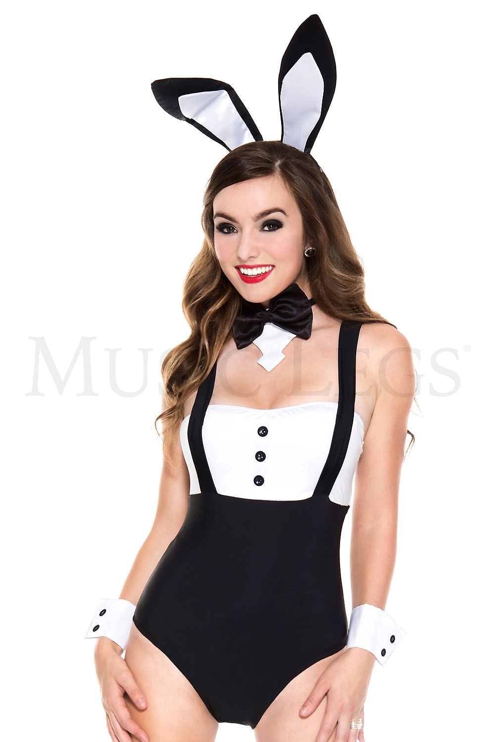 Playtime Rabbit costume kit includes Rabbit ears, bow tie, cuffs and plush tail. Bodysuit sold separately.